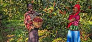 Young African women collecting coffee cherries, East Africa